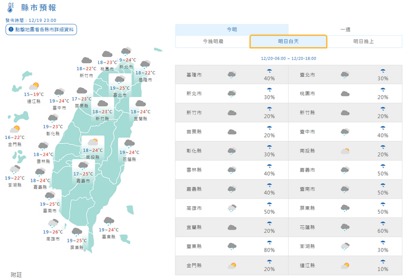 溫度方面,各地高溫普遍為23至25度,低溫為17至19度,大致感受舒適偏涼。離島澎湖多雲時陰短暫雨,19至22度,金門多雲短暫雨,16至22度,馬祖晴時多雲,15至19度。