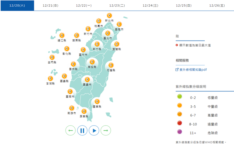 紫外線指數方面,週六所有縣市皆為「中量級」。(擷取自中央氣象署網站)