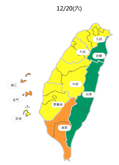 空氣品質方面,週六環境風場為偏東風,西半部位於背風側,擴散條件稍差,污染物易累積。宜蘭、花東空品區為「良好」等級;北部、竹苗、中部、雲嘉南空品區及澎湖為「普通」等級;高屏空品區及馬祖、金門為「橘色提醒」等級。