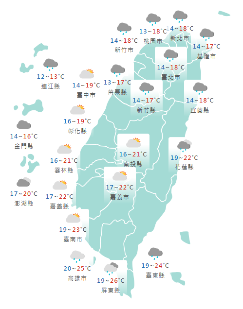 中央氣象署表示,今天(25日)各地氣溫明顯下降,北部及宜蘭氣溫越晚約低,白天北部、宜蘭高溫僅18、19度,整天濕冷,中南部及台東高溫22至24度,今夜至明晨是此波冷氣團氣溫最低的時段,預測中部以北及宜蘭低溫僅12、13度,南部及花、東約14至16度,空曠地區可能會再低一些。