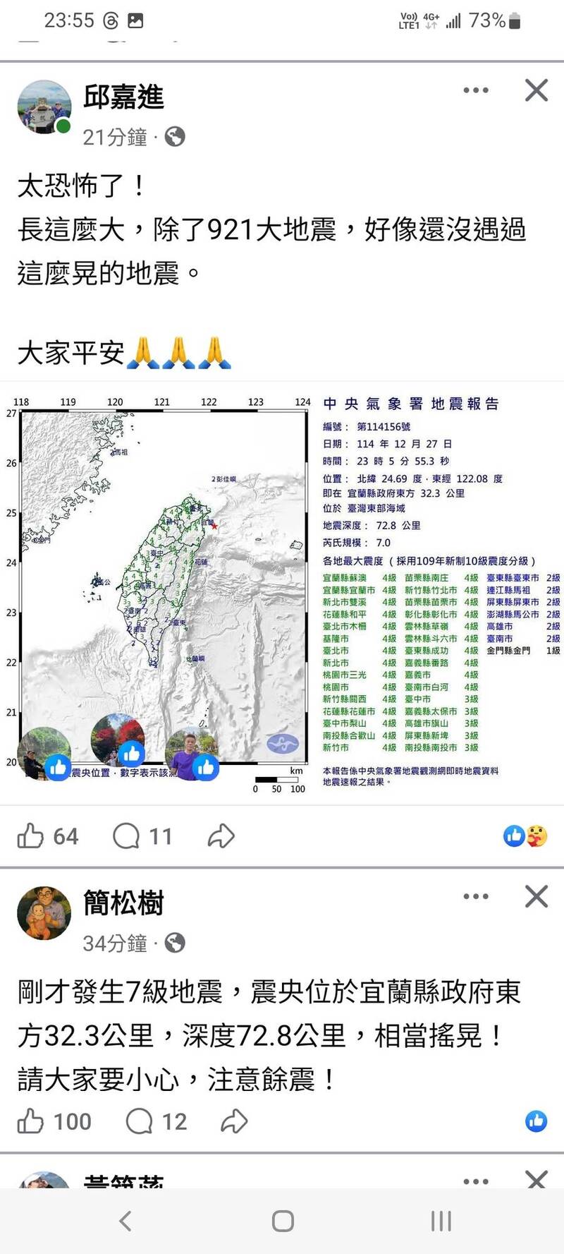 宜蘭7.0強震,宜蘭市、蘇澳等地最大震度4級,很多宜蘭鄉親在睡夢中驚醒,「如同旱地拔蔥,很大一震」、「感覺比921還搖」、「真的超級大又久,搖到頭都暈了」,有人沒有帶鑰匙就奪門而出,寒風中被關在門外,上網請求鎖匠到府開鎖,網路社群被地震文洗版。