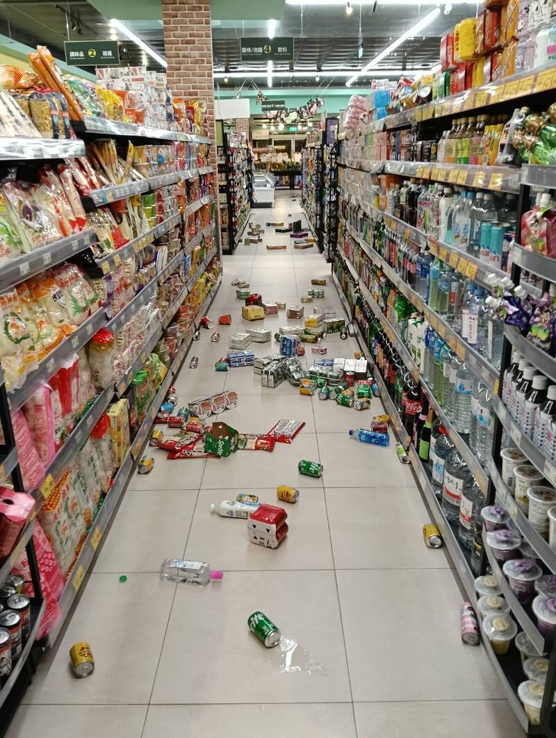 宜蘭昨晚強震,喜互惠生鮮超市貨架商品掉落地面。(圖由喜互惠超市提供)