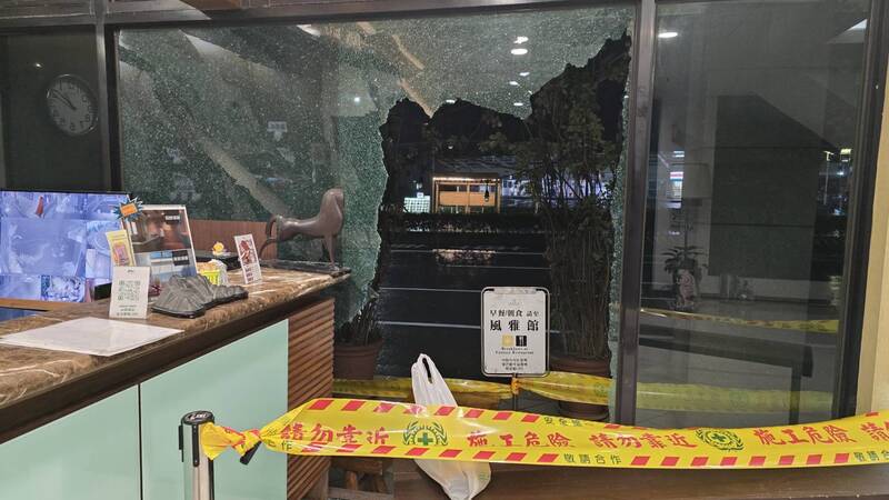 礁溪山泉飯店一樓大廳落地窗被強震震裂受損,業者拉起封鎖線提醒旅客注意安全。(圖由讀者提供)
