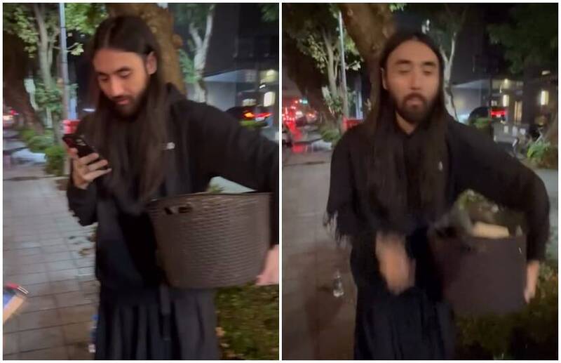 長髮男子不慌不忙地帶著置物籃逃生,鄉民紛紛笑稱「那是他降生的馬槽」。(Threads:angel870215授權使用)
