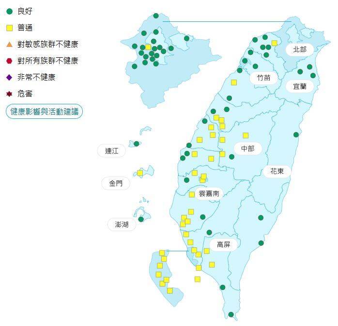 空氣品質部分,宜蘭及花東空品區為「良好」等級;北部、竹苗、中部、雲嘉南、高屏空品區及馬祖、金門、澎湖為「普通」等級,高屏空品區及馬祖、金門地區短時間可能達橘色提醒等級。