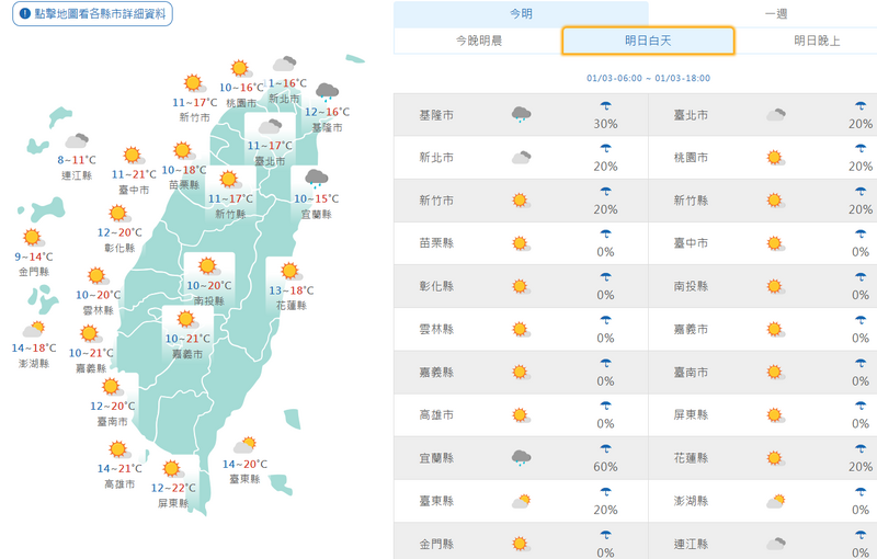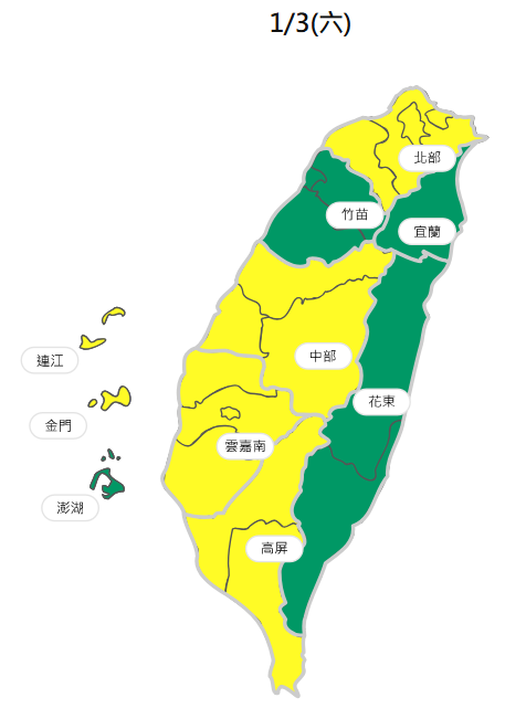 週六(3日)受強烈大陸冷氣團影響,高雄以北、宜、花及金、馬局部空曠地區,及近山區平地將有局部10度以下低溫發生的機率。