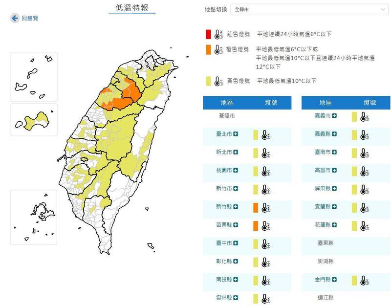 氣象署發布低溫特報。(圖擷取自中央氣象署)