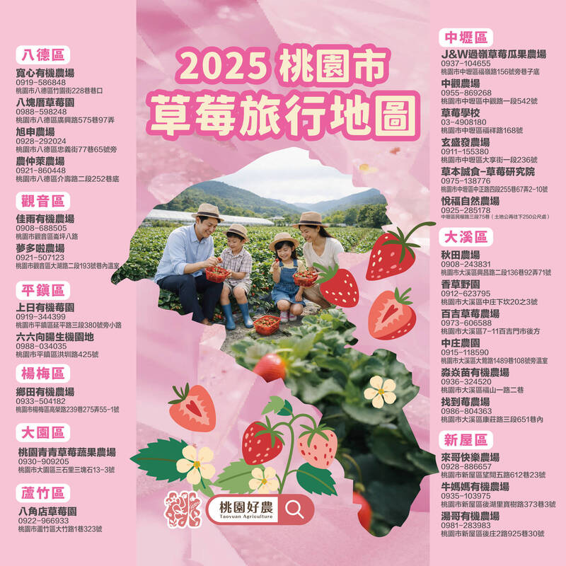 除了苗栗,近年桃園市也悄悄在草莓產業打開知名度,成為北台灣新興採草苺去處,桃市府農業局表示,桃園市草莓栽種達33萬8800株,較前年10萬餘株大幅增長,桃園市草莓推廣協會也公布最新的「草莓地圖」,提供民眾按圖索驥,享受採果樂趣。