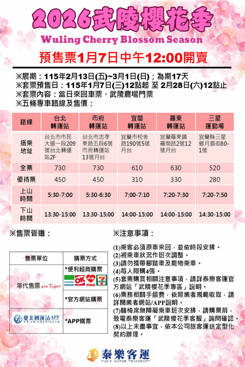 武陵農場櫻花季2/13~3/1管制 3家客運可購票入園
