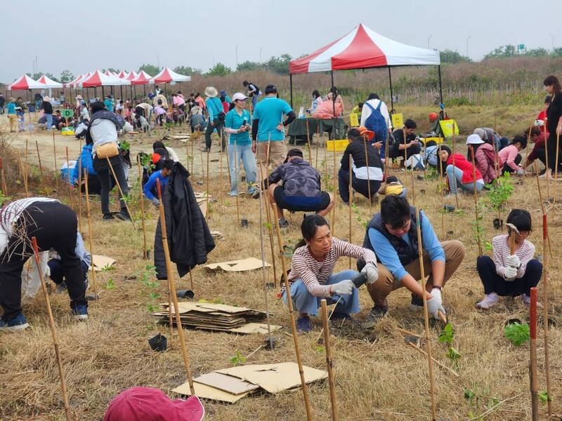 眾人分工合作栽種苗木,將荒漠海岸逐步轉化為青翠林帶。(高雄市公園處提供)