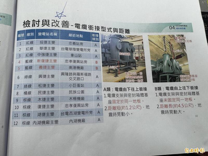 北捷指出,類似電纜銜接型式(B類)還有板南線南港機廠的義捷主變電站,後續一併研擬強化電纜固定措施、空心磚牆韌性,玻璃鋁窗改成釋壓型式,導入在線監測、參考台電後增加檢查機制,精進應變程序和人員安全觀念訓練。其餘10處主變電站則屬由下往上銜接(A類),距離較短約1.2公尺,地震時晃動小。