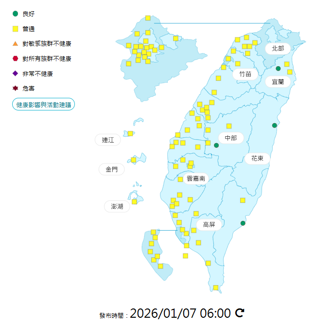 今日各地空氣品質概況。(圖擷自環境部空氣品質監測網)