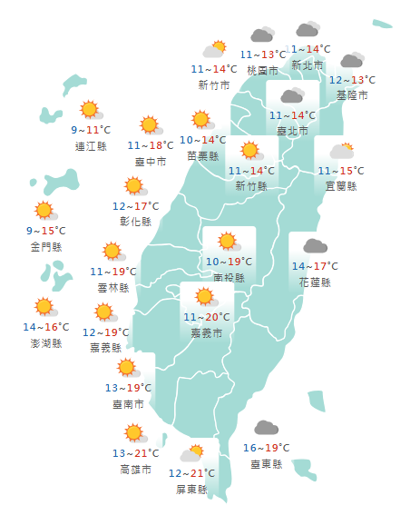 降雨方面,桃園以北、東半部地區及恆春半島雲量較多,有零星降雨機會,其他地區為多雲到晴的天氣。離島天氣方面,澎湖多雲時晴,14至16度,金門晴時多雲,10至15度,馬祖晴時多雲,9至11度。