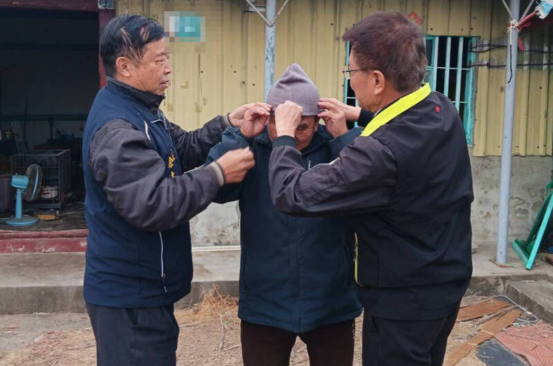 台南學甲區長張明寶(右)探視關懷獨居長者,協助長者試戴毛帽保暖。(公所提供)