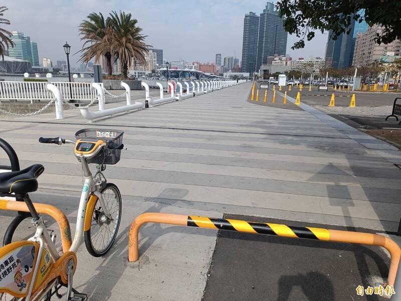 高雄流行音樂中心沿岸,雖有車擋,但單車仍可通行。(記者洪定宏攝)