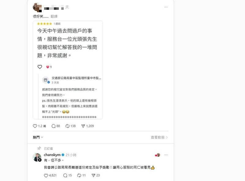 台中監理站近日在Google上獲得一則五星好評,評論民眾指出,去辦事時遇到一位「光頭張先生」很親切地解答了他的一堆問題。沒想到,「張先生」本人卻哀怨表示「還有幾根頭髮,不算光頭」引發網友熱議。對此,交通部長陳世凱指出,他會請公路局長轉達這份肯定,並給予獎勵,他還針對頭髮部分偷偷糗對方「有,但不多。」