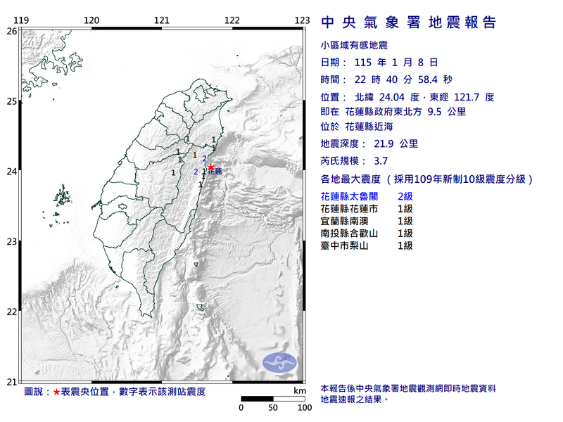 另外,花蓮縣近海昨天深夜10點40分也發生規模3.7小區域有感地震,震央在花蓮縣政府東北方9.5公里,地震深度21.9公里,最大震度花蓮縣地區2級;宜蘭縣、南投縣及台中縣1級。