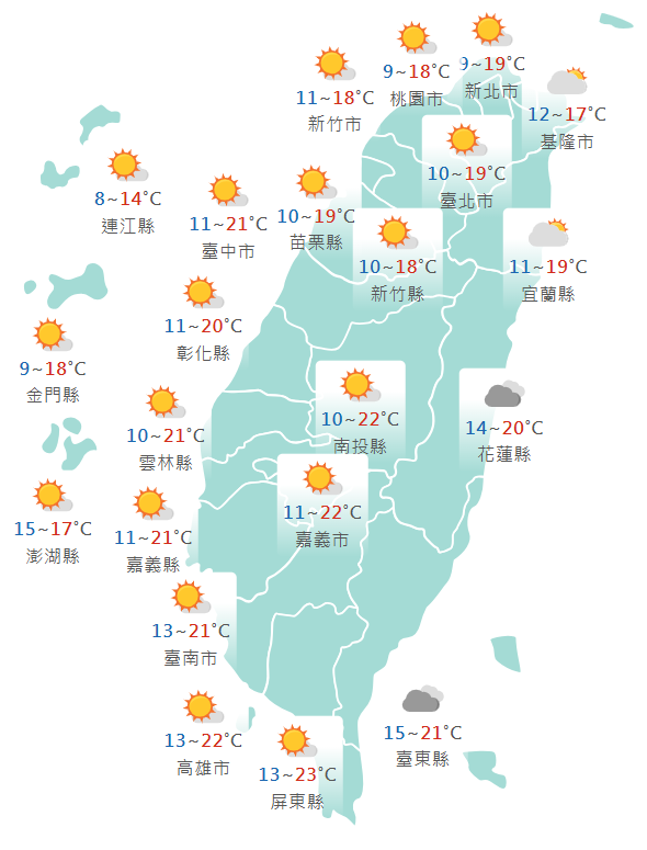 中央氣象署指出,今天(10日)輻射冷卻影響,各地清晨寒冷,氣象署也持續針對18縣市發布低溫特報,包含中部以北及宜蘭普遍為9至11度,南部及花東為12至15度,局部空曠或近山區河谷氣溫則更低一些,高雄以北及宜、花、金、馬都有10度以下低溫出現的機率,但白天氣溫稍回升,預測北部及宜蘭高溫約19度,中南部及花東為20至23度,西半部日夜溫差大,早晚外出請注意保暖。