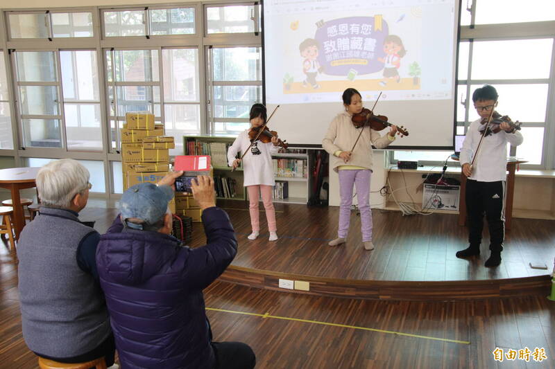 新埔枋寮國小的「愛樂小提琴社團」用樂音感謝退休老師江國雄(坐者左)為他們帶來書香。(記者黃美珠攝)