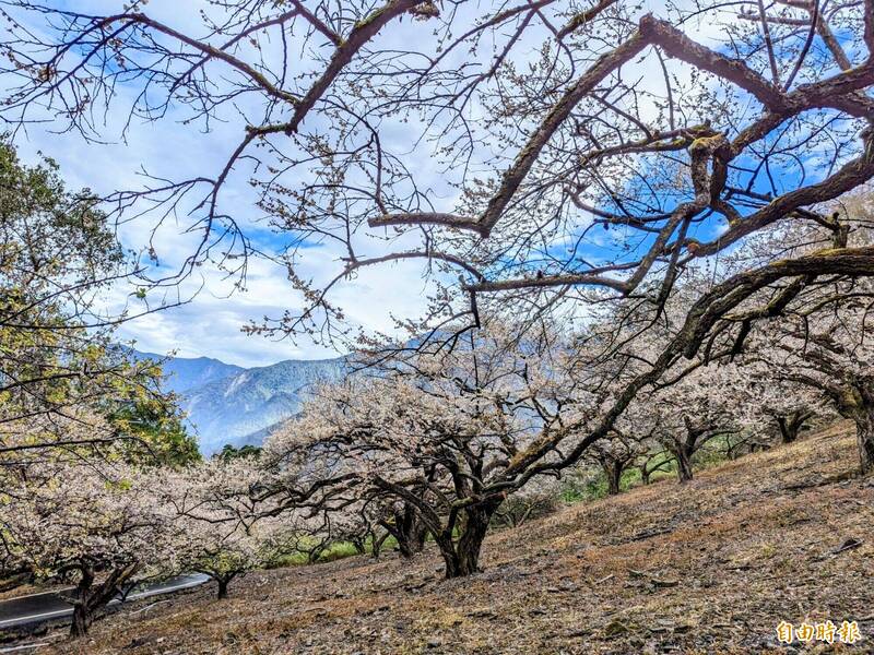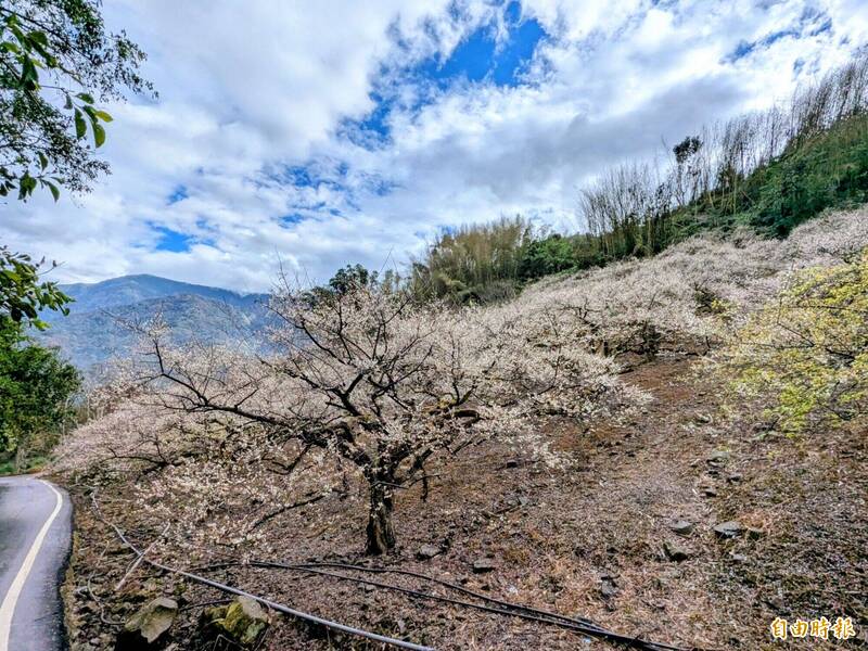 信義鄉近日受惠濕冷天氣,梅花花況進入高峰,像是土場梅區幾乎滿開,外坪頂則因海拔較高,佔地近20公頃梅區花況更達6、7成,整片山坡一片雪白花海,還能聞到淡雅梅花清香,成為賞梅一大享受。