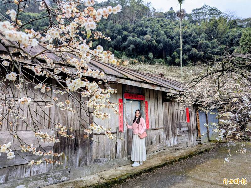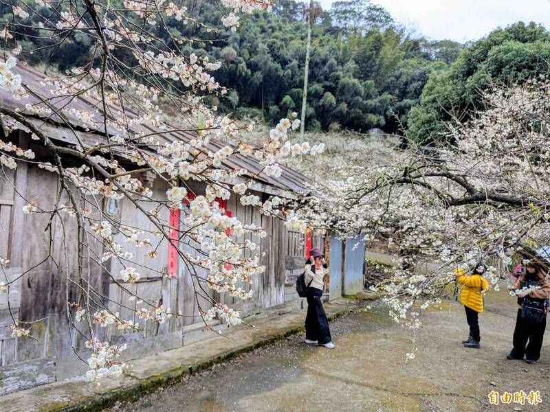 南投信義鄉外坪頂梅花爆開,梅花與古厝相互輝映,吸引許多民眾打卡拍照。(記者劉濱銓攝)