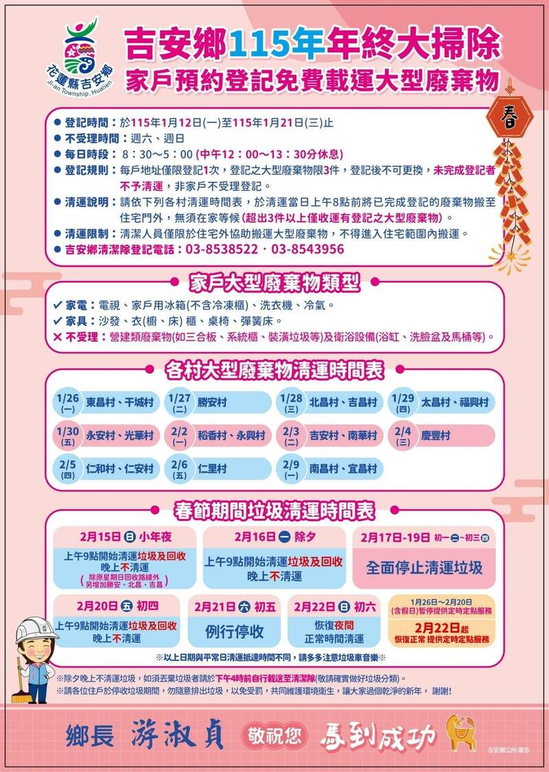 下個月就要過年了,花蓮市、吉安鄉公所配合中央政策,將在2月8日至2月14日辦理「國家清潔週」,並提前自1月12日至21日受理春節前大型廢棄物清運申請,每戶限免費清運大型廢棄物三件,並以一次為限,需要提前電話預約;農曆春節初一到初三(2月17至19日)全面停收垃圾。