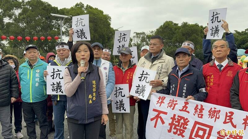 宜蘭縣環保局長許嘉琦(持麥克風者)同意五結鄉公所動支回饋金剩餘款,抗議群眾決定暫緩圍廠行動。(資料照)