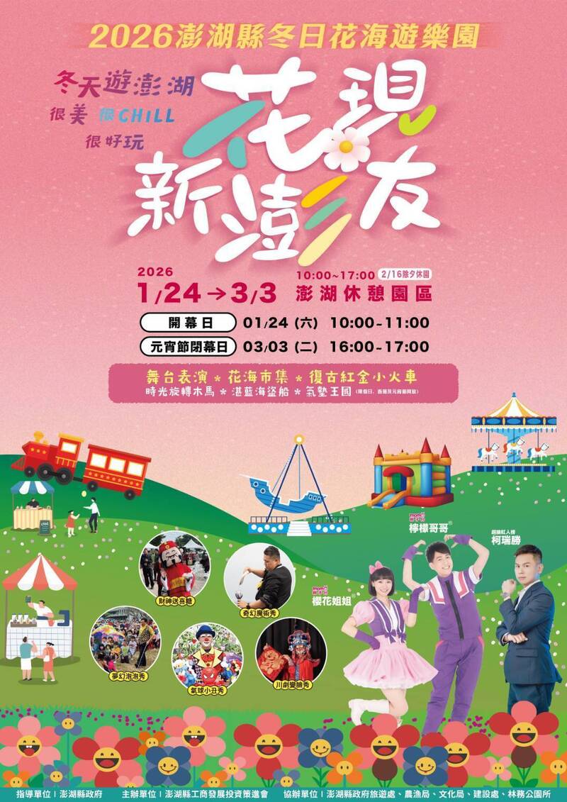 為讓澎湖民眾在冬季與春節期間,也能擁有舒適、親切且具節慶感的休憩空間,澎湖縣政府主辦「2026澎湖縣冬日花海遊樂園《花現新澎友》」,自1月24日起於澎湖休憩園區展開,期望成為澎湖民眾春節期間「走春、散步、親子同遊」的生活場域。