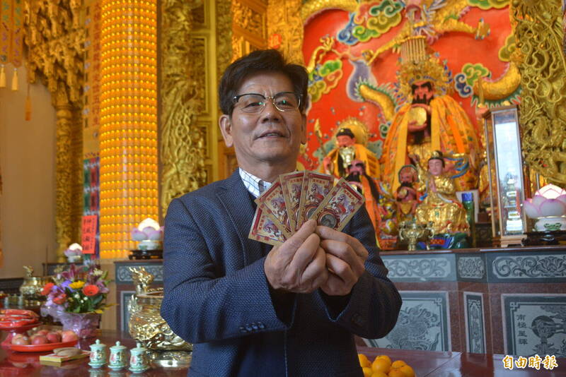 富陽軒八卦祖師廟住持「富聖老師」提醒,馬年姓名中若有「文」字或「哲」字的民眾要多注意,可安太歲、點光明燈求平安。(記者陳建志攝)