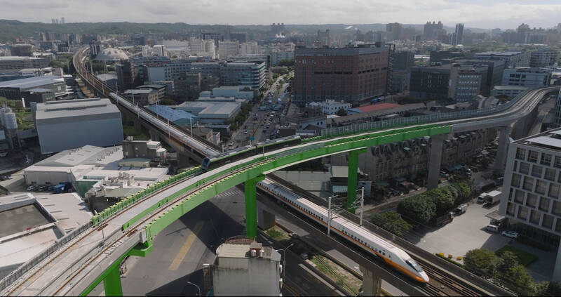桃市府捷運工程團隊特別記錄綠線列車測試時與高鐵列車交會瞬間。(捷工局提供)