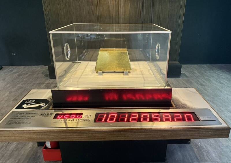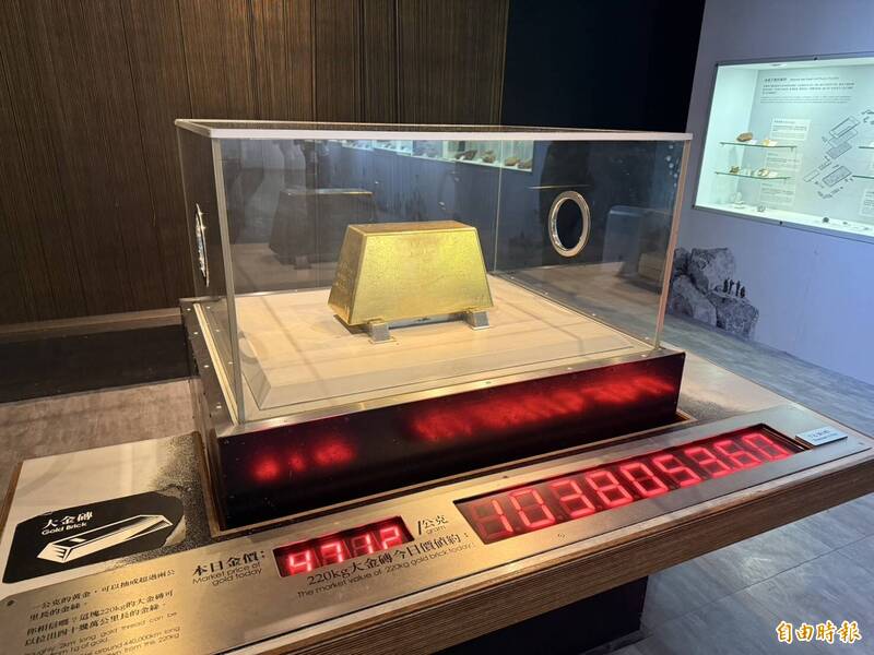 新北市黃金博物館鎮館之寶「大金磚」重達220.3公斤,今天(12日)館方顯示每公克金價4712元,「大金磚」價格已飆破10.38億元!創大金磚進館以來新高價。(記者俞肇福攝)