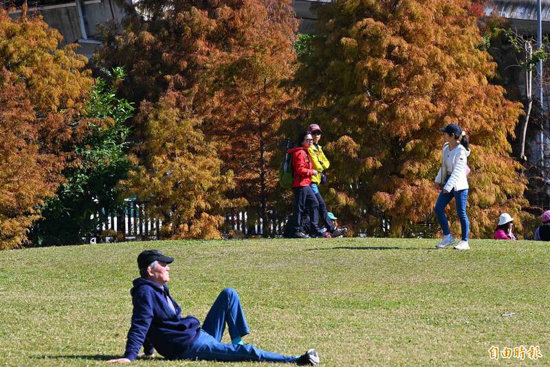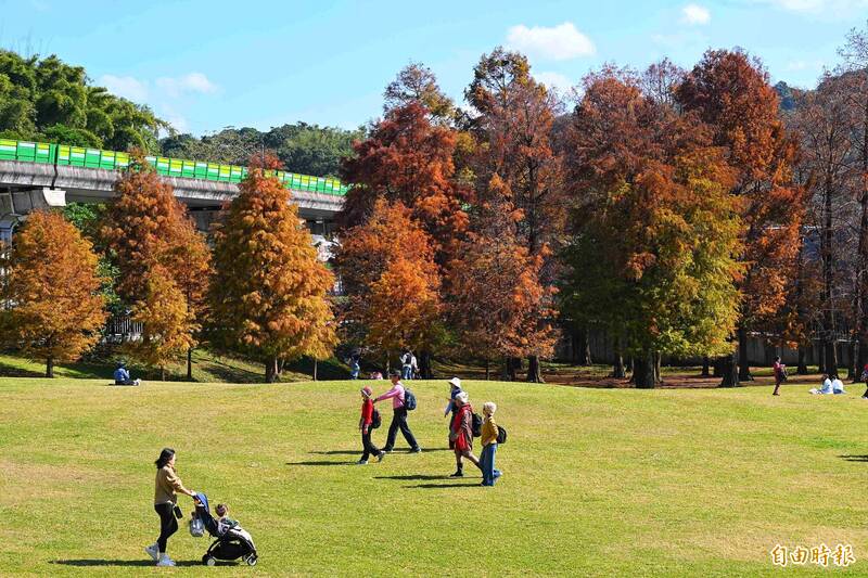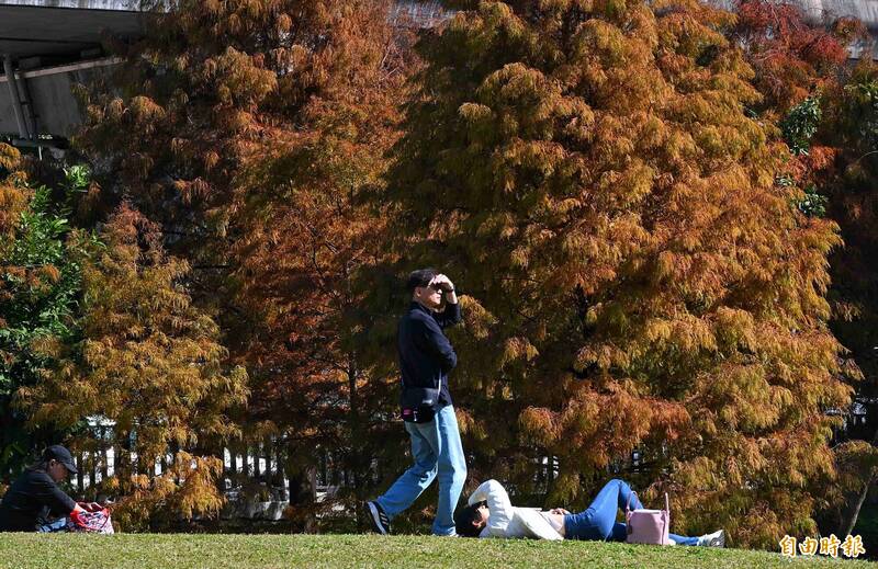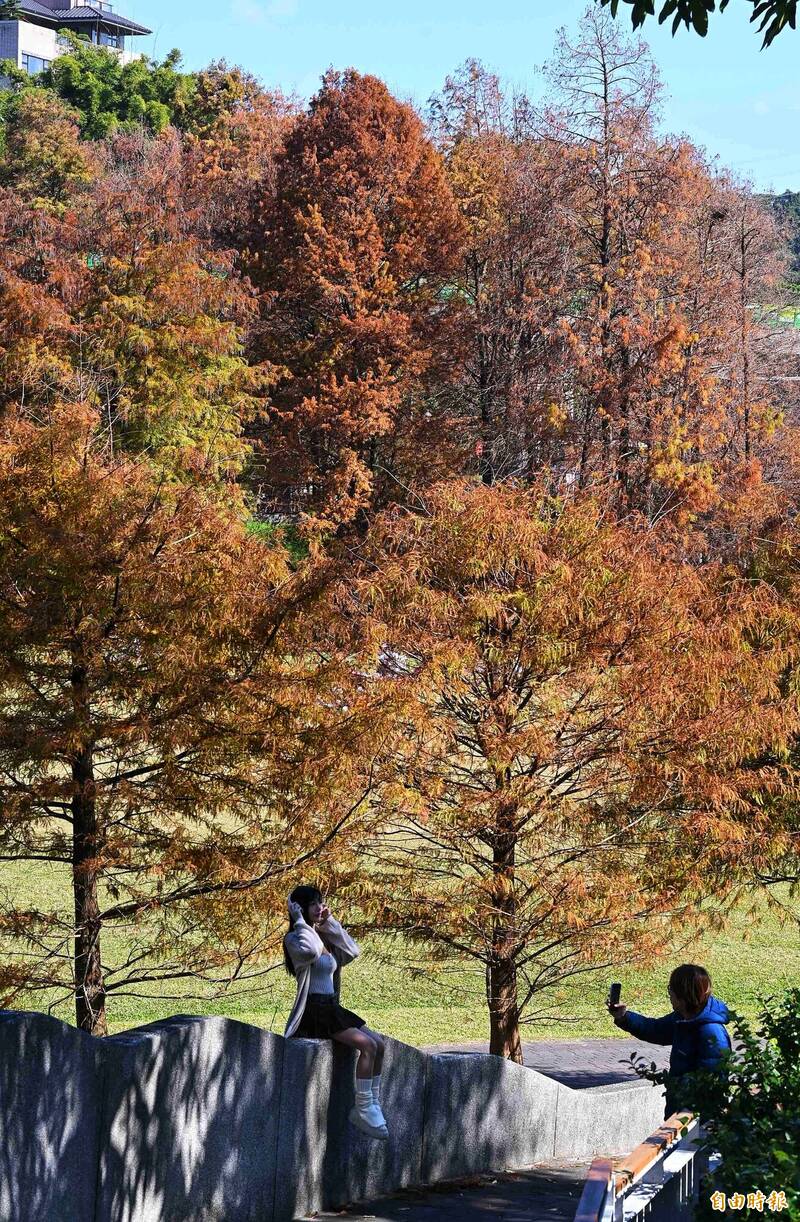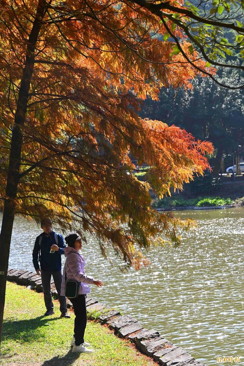 14日冷氣團減弱,天氣晴朗穩定,北市大湖公園的落羽松正值金黃、橘紅交錯,吸引許多民眾前去賞景拍照。(記者張嘉明攝)