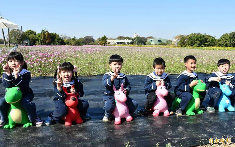 花海農田內小朋友愉快地享受騎馬樂。(記者湯世名攝)