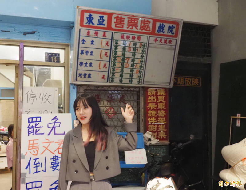 立委黃捷去年到草屯為罷免行動助講,也與東亞戲院售票口合照。(資料照,記者陳鳳麗攝)