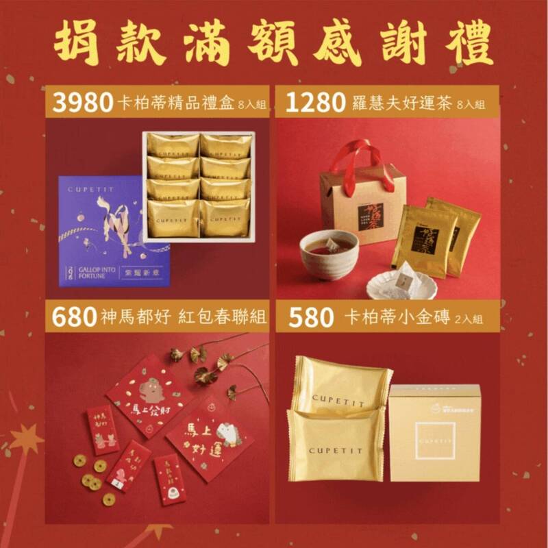 羅慧夫邀請民眾一起讓好事發生,也讓好年開始,捐款送限量好禮,3980元以上:送卡柏蒂精品禮盒1份;捐款1280元以上送羅慧夫好運茶1份;捐款680元以上送神馬都好紅包春聯組1份;捐款580元以上送卡柏蒂小金磚1份。