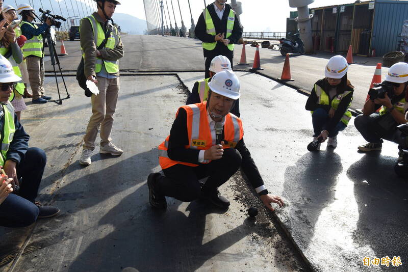 淡江大橋完成「GUSS」瀝青混凝土路面鋪設,交通部長陳世凱說明工法。(記者吳亮儀攝)