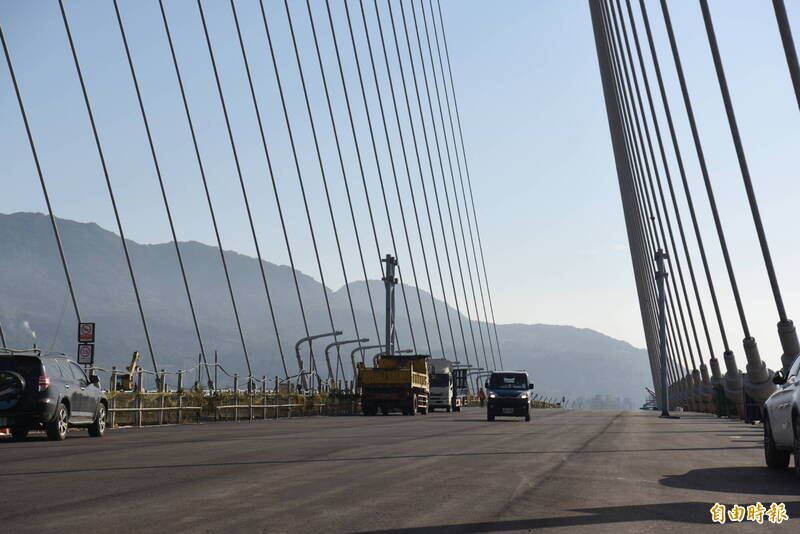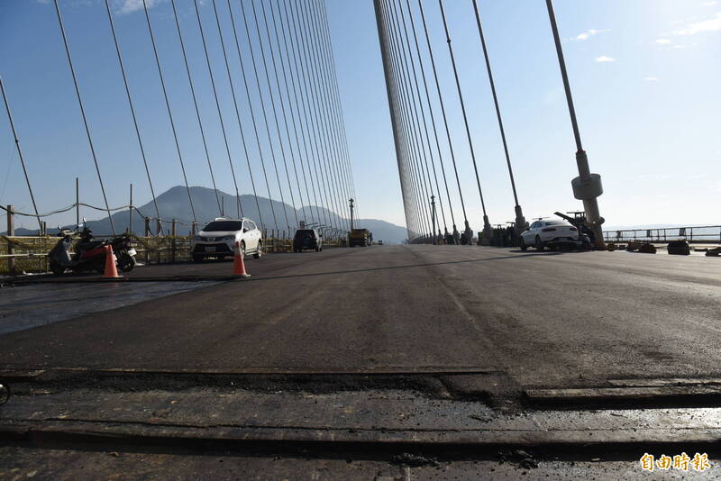 淡江大橋完成「GUSS」瀝青混凝土路面鋪設。(記者吳亮儀攝)