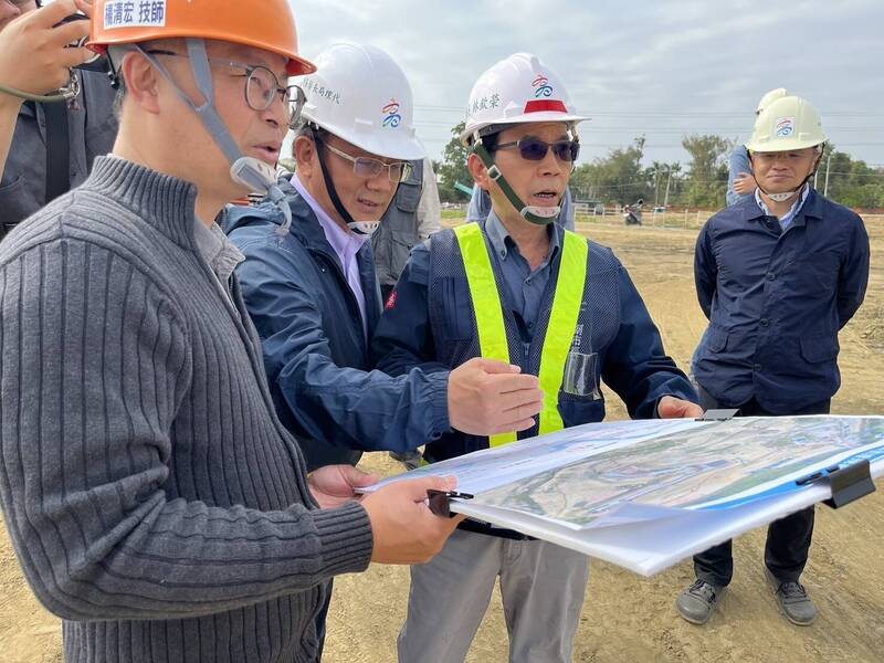 副市長林欽榮今視察十九灣滯洪池,肯定工程進度超前。(市府提供)