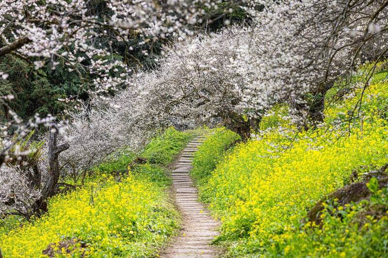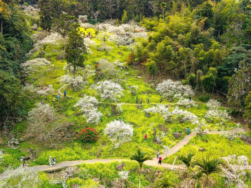 信義鄉農會表示,今年冷氣團接連報到,山區也有水氣,讓鄉內傳統梅區烏松崙梅花盛開,目前正值滿開,搭配梅區廣泛種植的油菜花,翠綠大地綴滿雪白花海,景象美不勝收,預計花況可到下週。