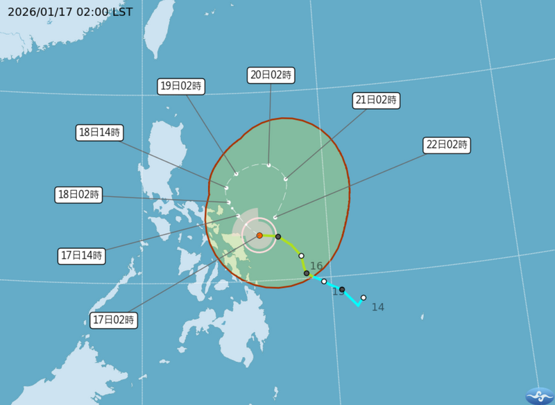 目前位於菲律賓東南方海面上的輕度颱風洛鞍(NOKAEN),預計未來在菲律賓東南方至東方海面活動,且強度發展有限,對台灣無直接影響。(圖擷取自中央氣象署)