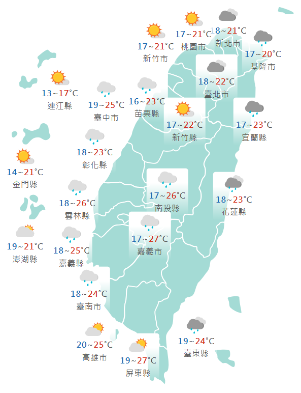 今日氣溫方面,各地低溫普遍在16至19度,白天北部、東半部高溫約22至24度,中南部高溫來到24至27度。