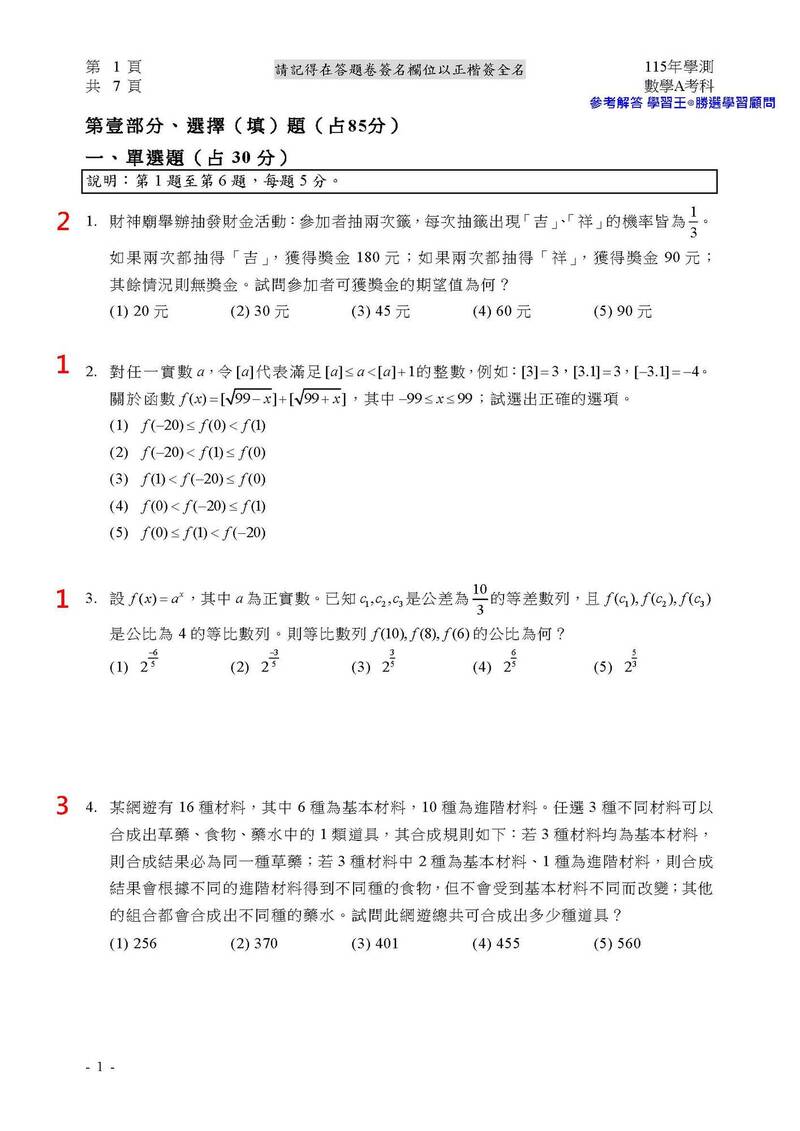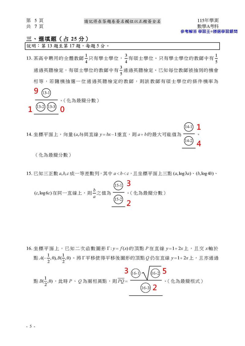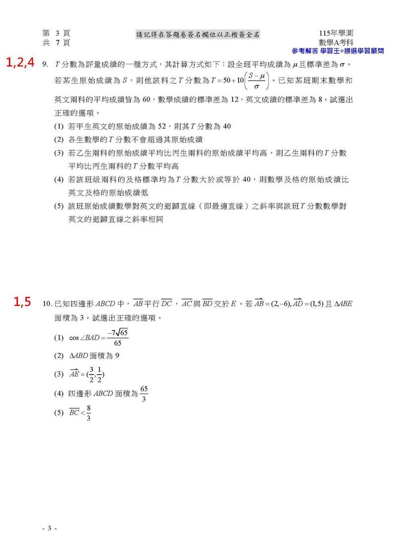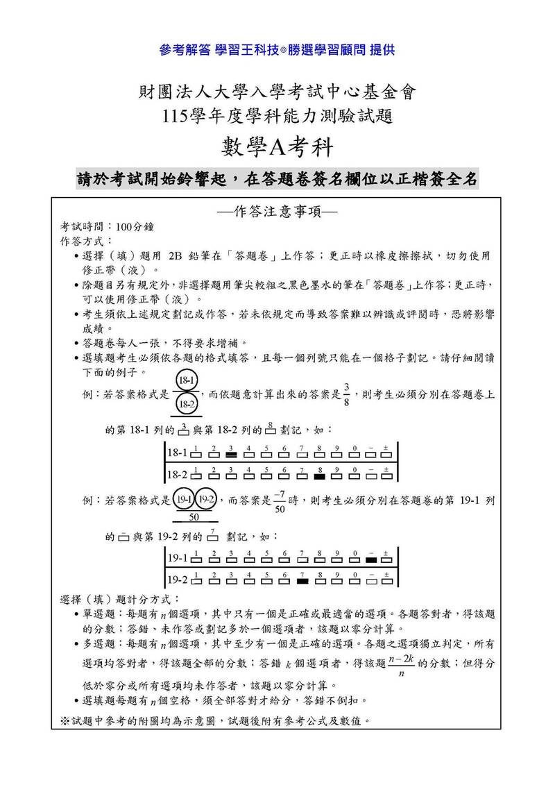 數學A參考解答由學習王科技◎勝選學習顧問提供,正確答案請以大考中心公布為準。
