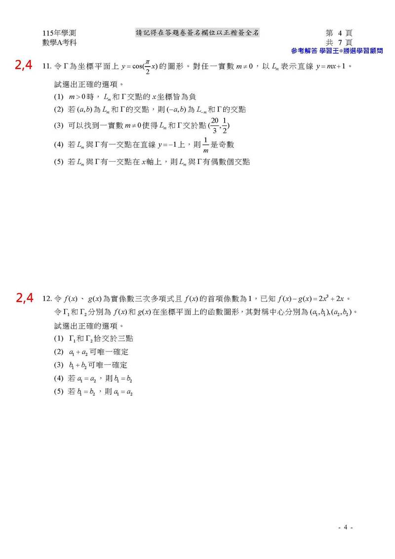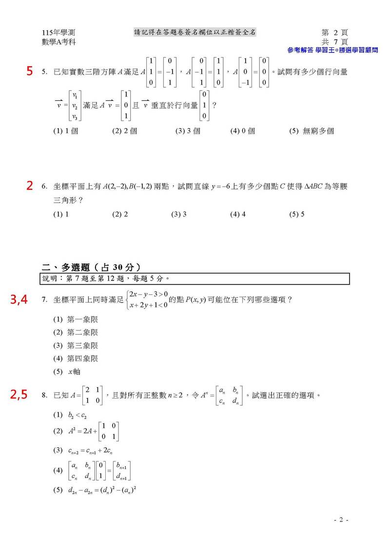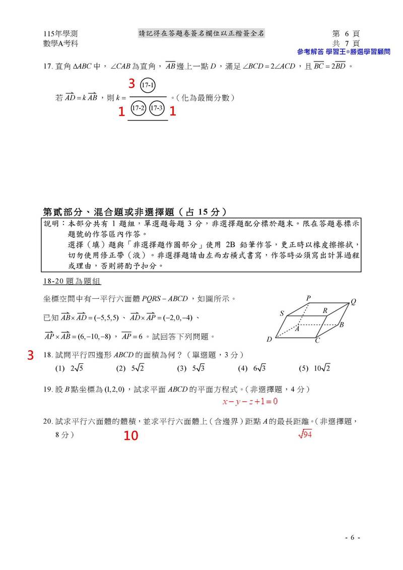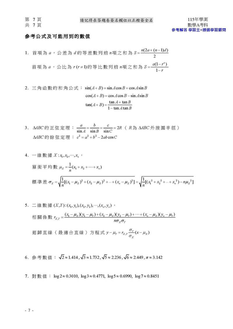 數學A參考解答由學習王科技◎勝選學習顧問提供,正確答案請以大考中心公布為準。