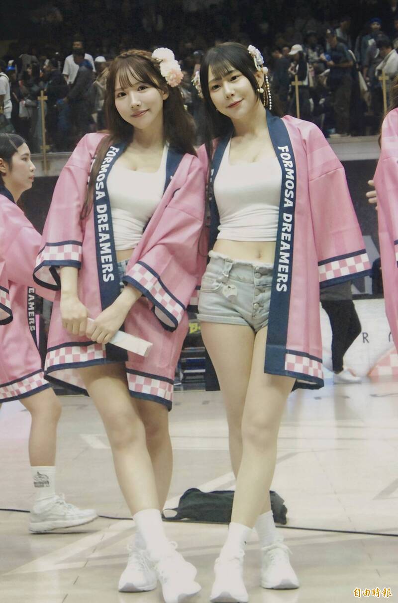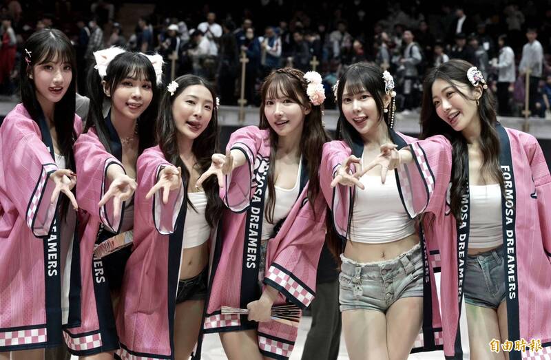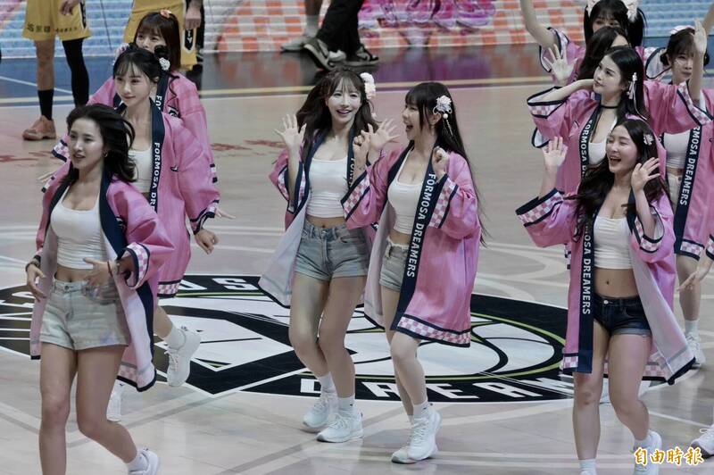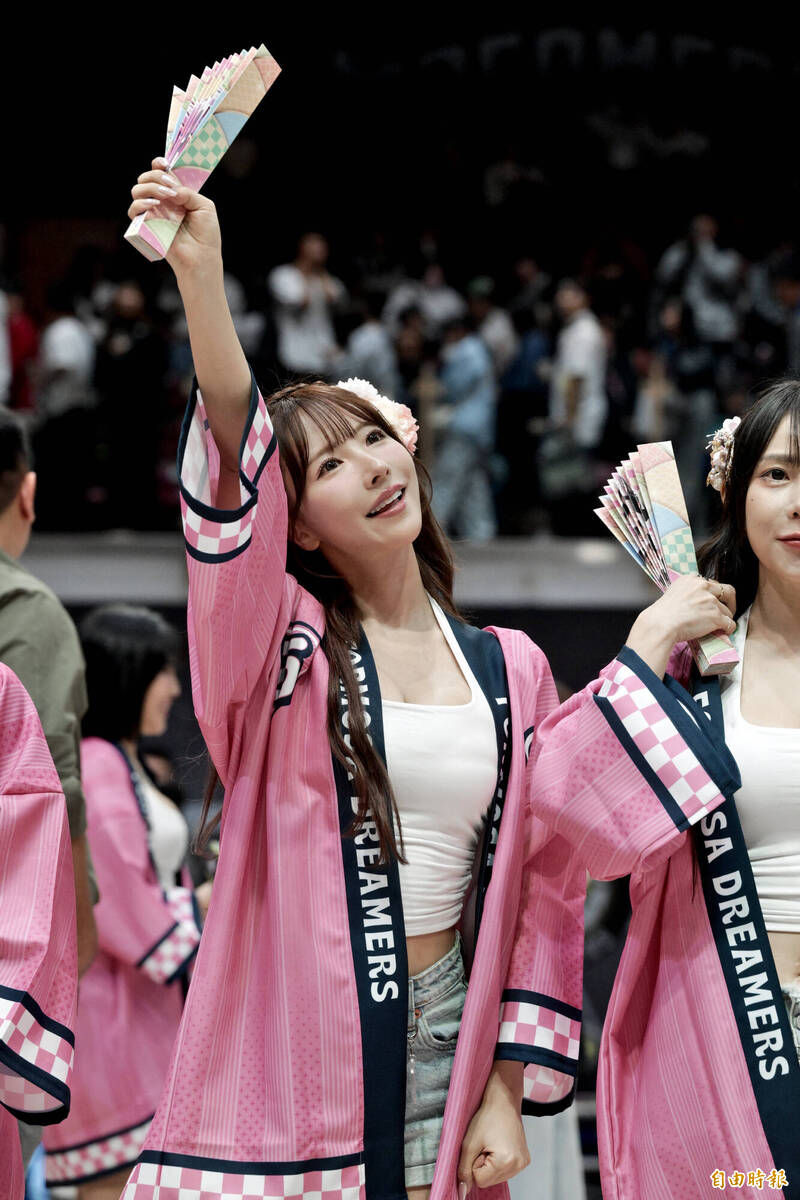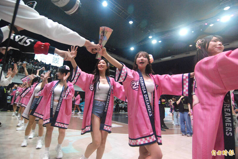Formosa Sexy啦啦隊全員亮相主場應援,粉色戰袍吸引全場目光,氣氛熱烈。(記者王藝菘攝)
