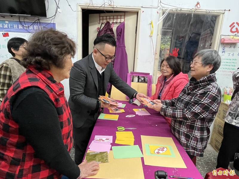 誠仁里民活動中心今天舉辦手作活動,20多位長者穿得厚厚衣服準備上課,童子瑋帶著暖暖包來送給現場長輩,長輩都很高興,高喊「童子瑋有作為」,常常來關心長輩。