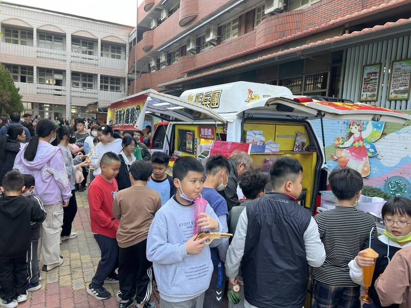 斗六市公誠國小今天舉辦校慶園遊會,校方還邀請校外餐車讓學生認識餐車營運。(記者黃淑莉攝)