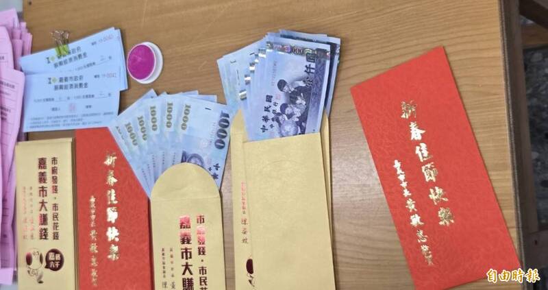 嘉義市今普發6000元與65歲以上長輩春節禮金1000元,特製金色、紅色紅包袋。(記者王善嬿攝)