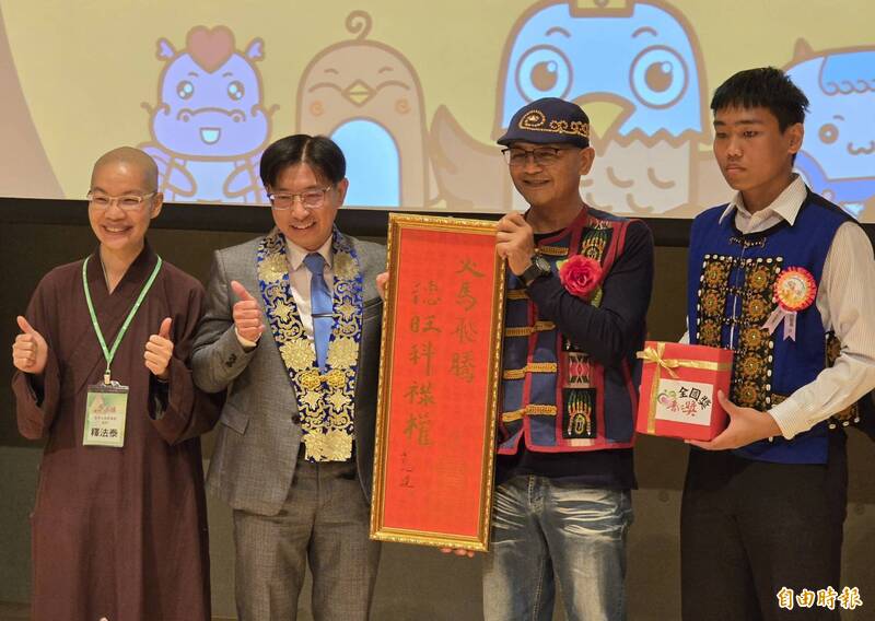 靈鷲山普仁獎,高樹國中學生巴郡雁(右一)入圍全國獎項,其父親也到場參加。(記者葉永騫攝)