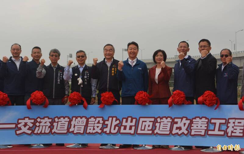 台74線十九甲北出匝道今天舉行通車典禮,包括交通部長陳世凱(右5)、台中市副市長黃國榮(右6)、立委何欣純(右4)等人都出席。(記者陳建志攝)