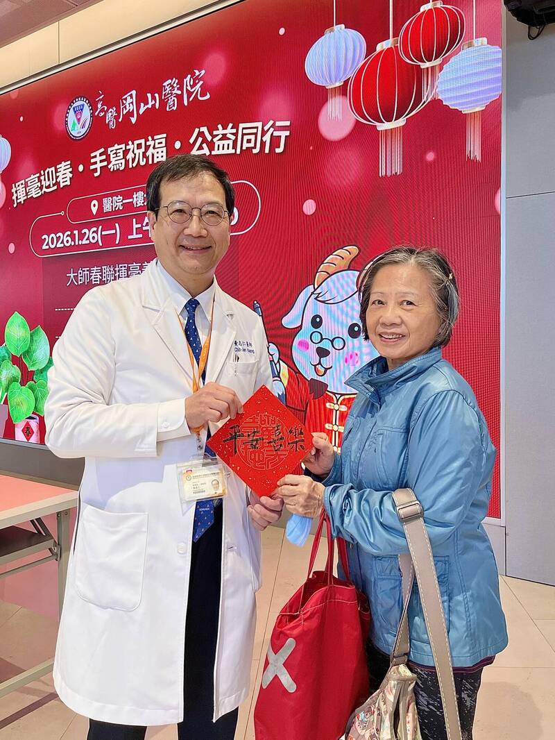 高醫岡山醫院副院長黃志仁(左)與民眾互動致贈春聯,傳遞新春祝福。(圖由高醫岡山醫院提供)